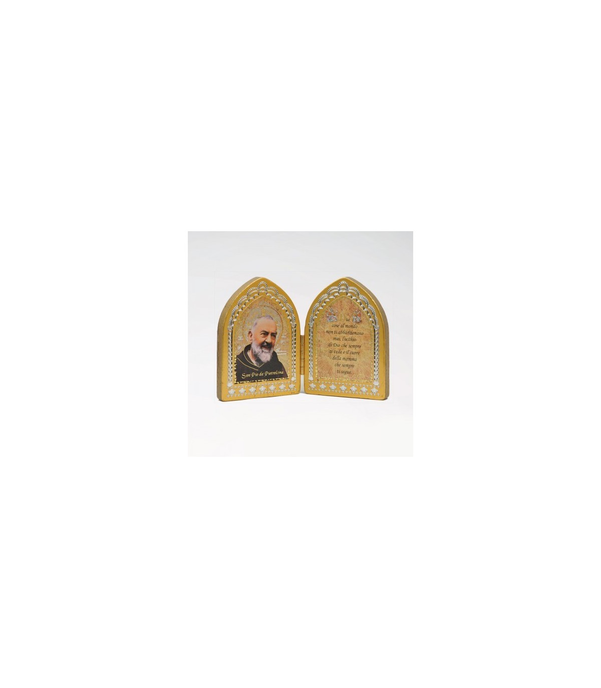 Golden Diptychon in Pappelsperrholz mit Druck Silber Fries. Buch-Verschluss mit goldener Reißverschluss. Prozessfarben drucken und heiß Vergoldung das Bild Darstellung von Padre Pio und seine "Gedanken". Retro mit einfachen Druck Fries geschmückt.(italiano)