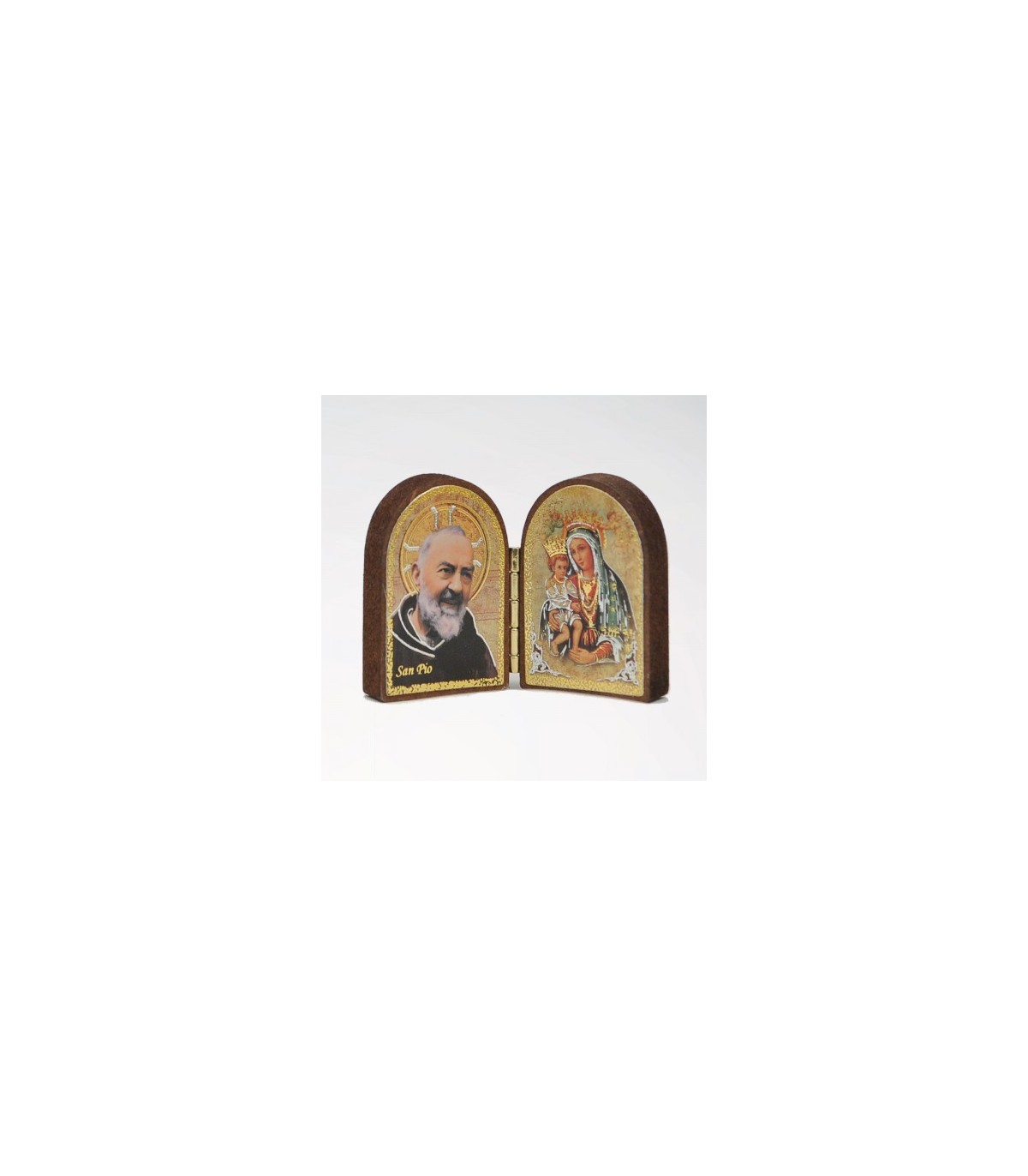 Diptychon malte MDF für eintauchen. Buch-Verschluss mit goldener Reißverschluss. Prozessfarben drucken und heiß Vergoldung das Bild Darstellung von Padre Pio und Madonna Delle Grazie.