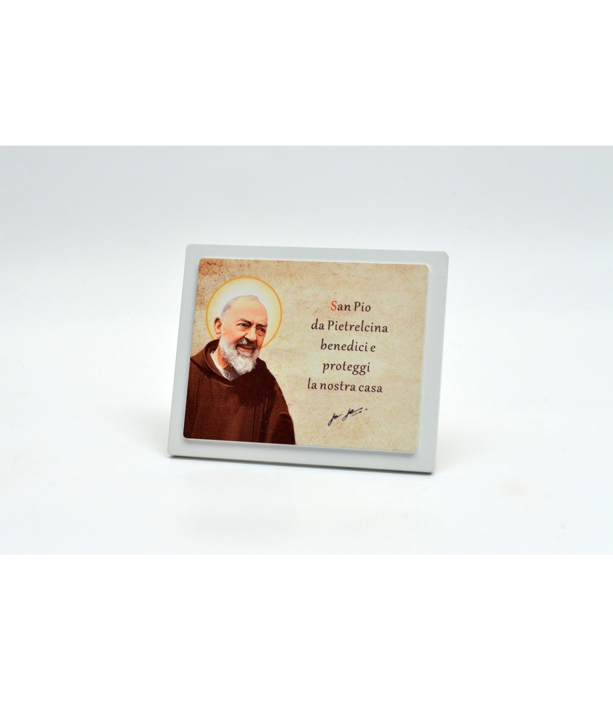 QUADRETTO ZWEISTUFIGE in Holz. DRUCK IN VIER-COLOR Bild repräsentierte SAN PIO mit Gebeten und Segnungen des Hauses. HOLE PRESENCE auf der Rückseite und UNTERSTÜTZUNG PLASTIC UNTERSTÜTZUNG.