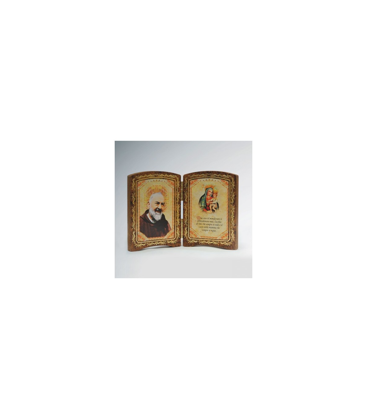 Díptico en MDF pintado por inmersión y ennoblece. Libro cierre con cremallera dorada. Proceso-impresión en color y dorado caliente la imagen que representa a Padre Pío, uno de su "pensamiento" y la Madonna delle Grazie.(italiano)