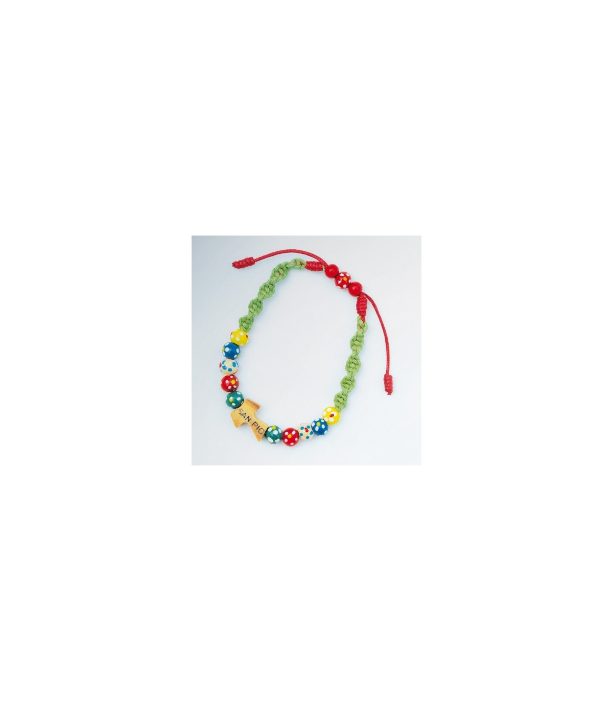 Deslizamiento de alambre había trenzado pulsera con cuerda de color verde natural y diez Rosario misionero en madera seca sazonada. Formado por granos de mano redondo pintado con diferentes colores: verde para África, rojo, azul blanco América para Europa, amarillo para Asia y Oceanía. Tau en madera de olivo con la inscripción: "San Pio".