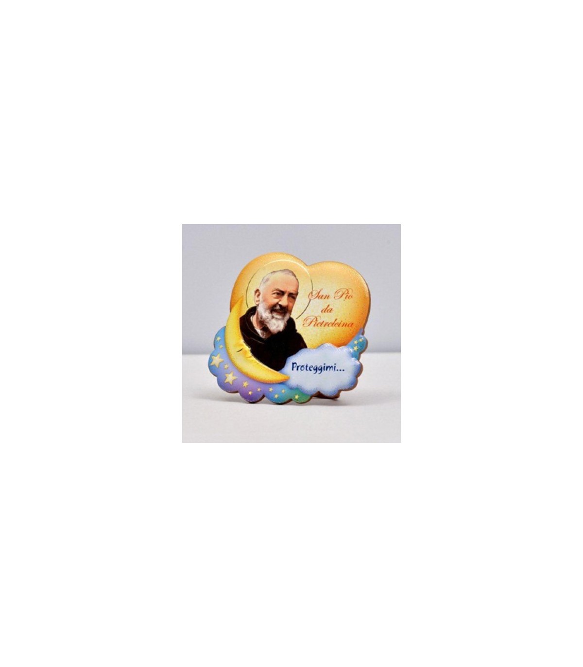 Square à termopolimero. Quadrichromie impression et chaud dorure l'image illustrant le Padre Pio. Application sur l'arrière du crochet en métal doré et support en plastique pour un soutien supplémentaire.(italiano)