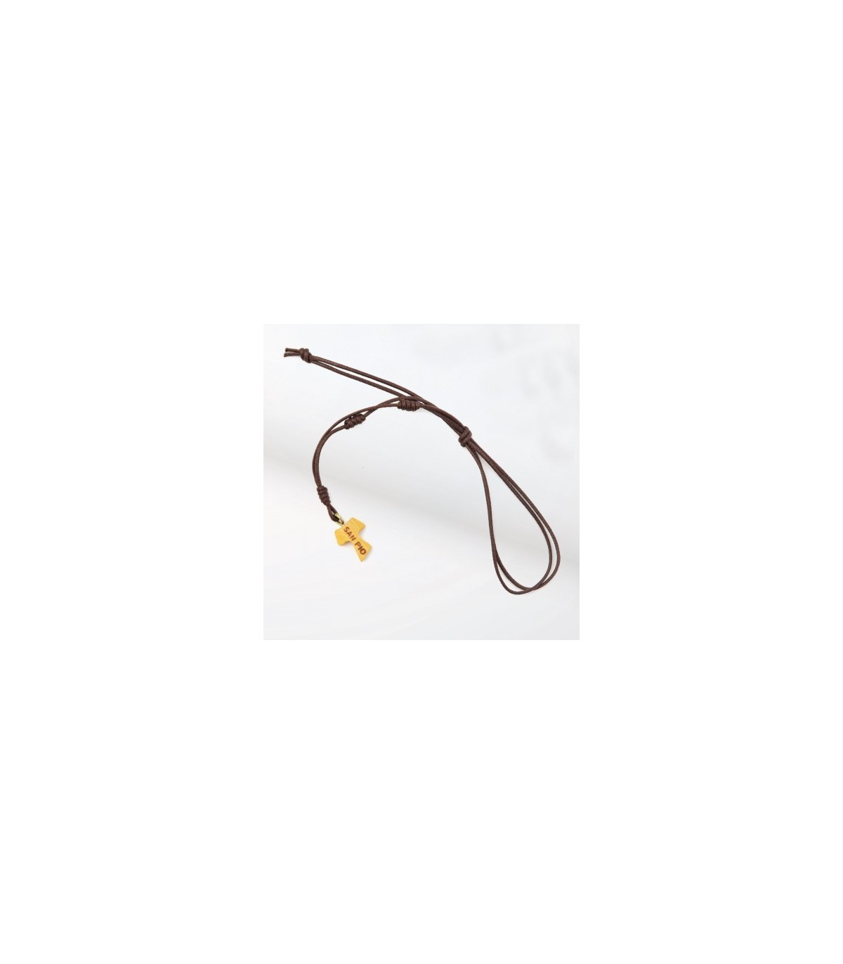 Collier cordon Cordon naturel avec trois noeuds. Croix de tau en bois d'Olivier avec inscription: « San Pio ».