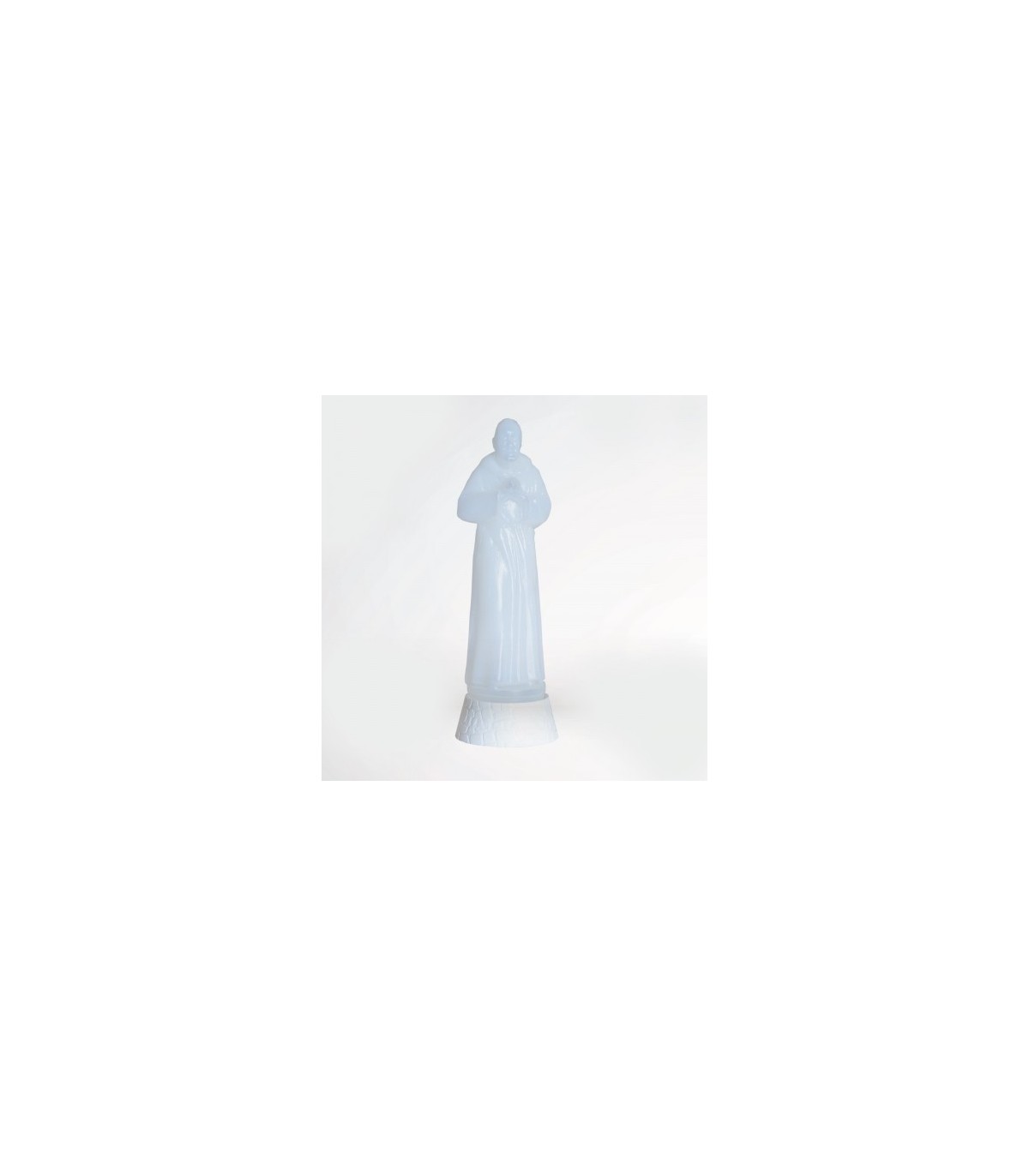 Récipient pour l'eau en PVC transparent représentant Padre Pio. Circulaire fermeture avec bouchon à vis, blanc PVC avec impression d'une « pensée » de Padre Pio.