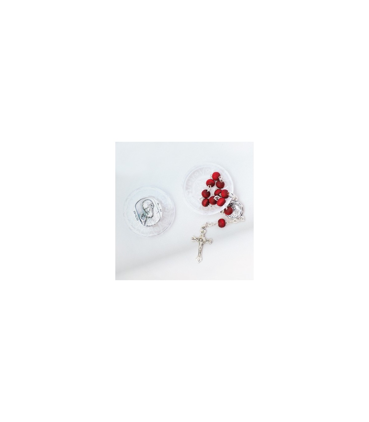 Ten wooden Rosary of red and fragrant for dipping. Smooth round grains and tying in silver plated metal. Coin with relief picture depicting Padre Pio and, on the back, relief picture depicting Santa Maria delle Grazie. Silver metal crucifix in relief. Plastic case with embossed image depicting Padre Pio.