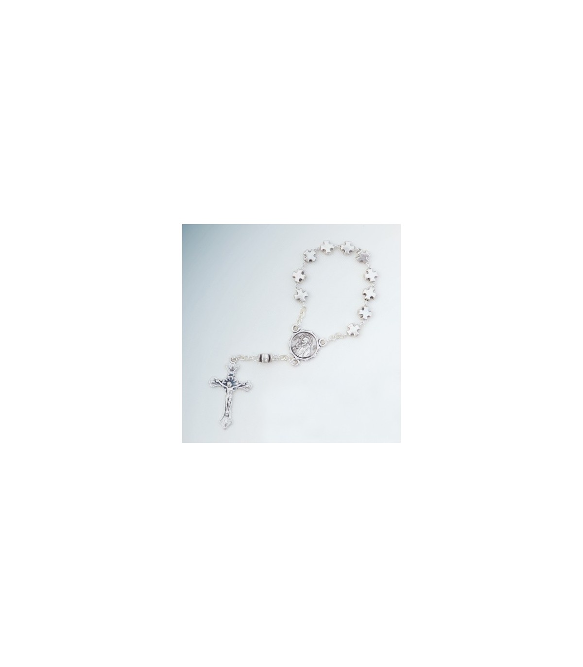 Ten metal Rosary with beads in the shape of a Celtic Cross and silver metal ligation. Coin with relief picture depicting Padre Pio and, on the back, relief picture depicting Santa Maria delle Grazie. Silver metal crucifix in relief.