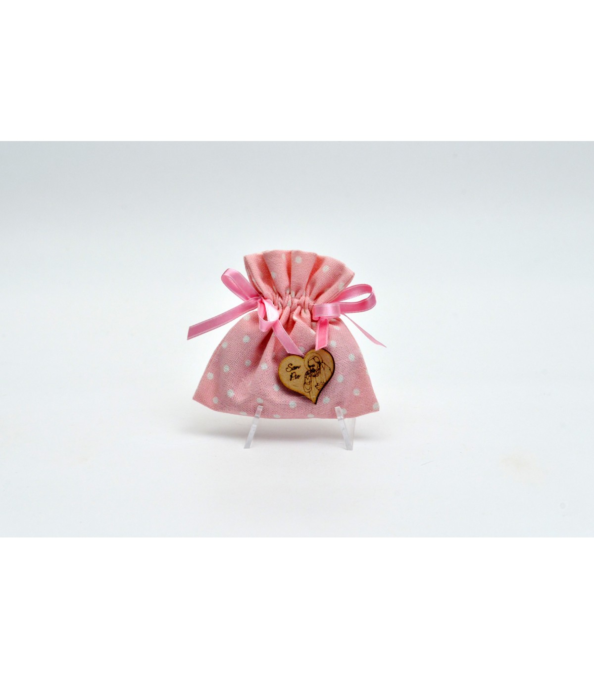SACCHETTO IN COTONE A POIS PER POT-POURRI. CHIUSURA IN RASO. APPLICAZIONE DI UN CUORE IN LEGNO CON INCISIONE DELL'IMMAGINE RAFFIGURANTE SAN PIO.