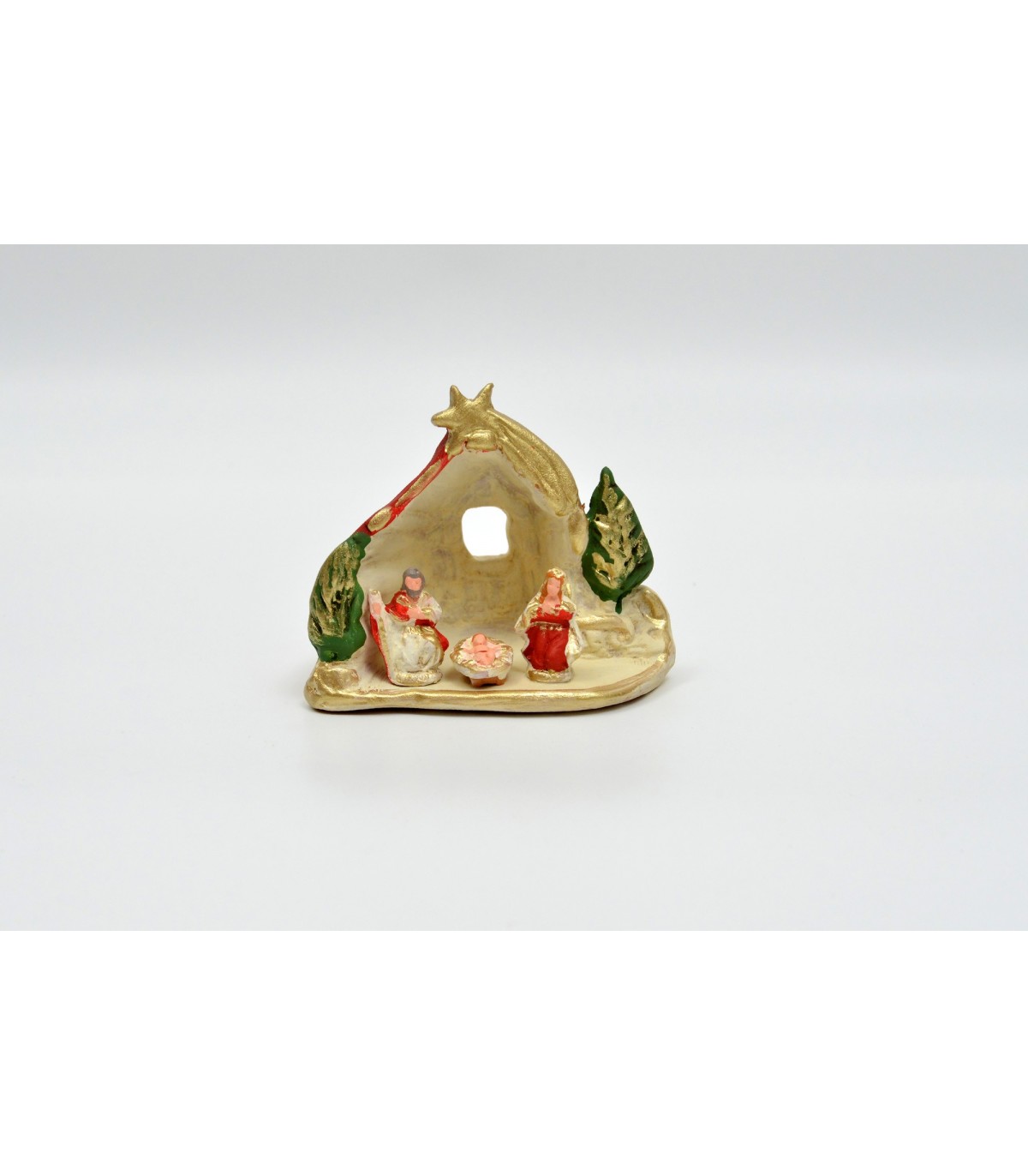 CAPANNA IN TERRACOTTA COMPLETA DELLA SACRA FAMIGLIA IN RESINA DIPINTA A MANO.