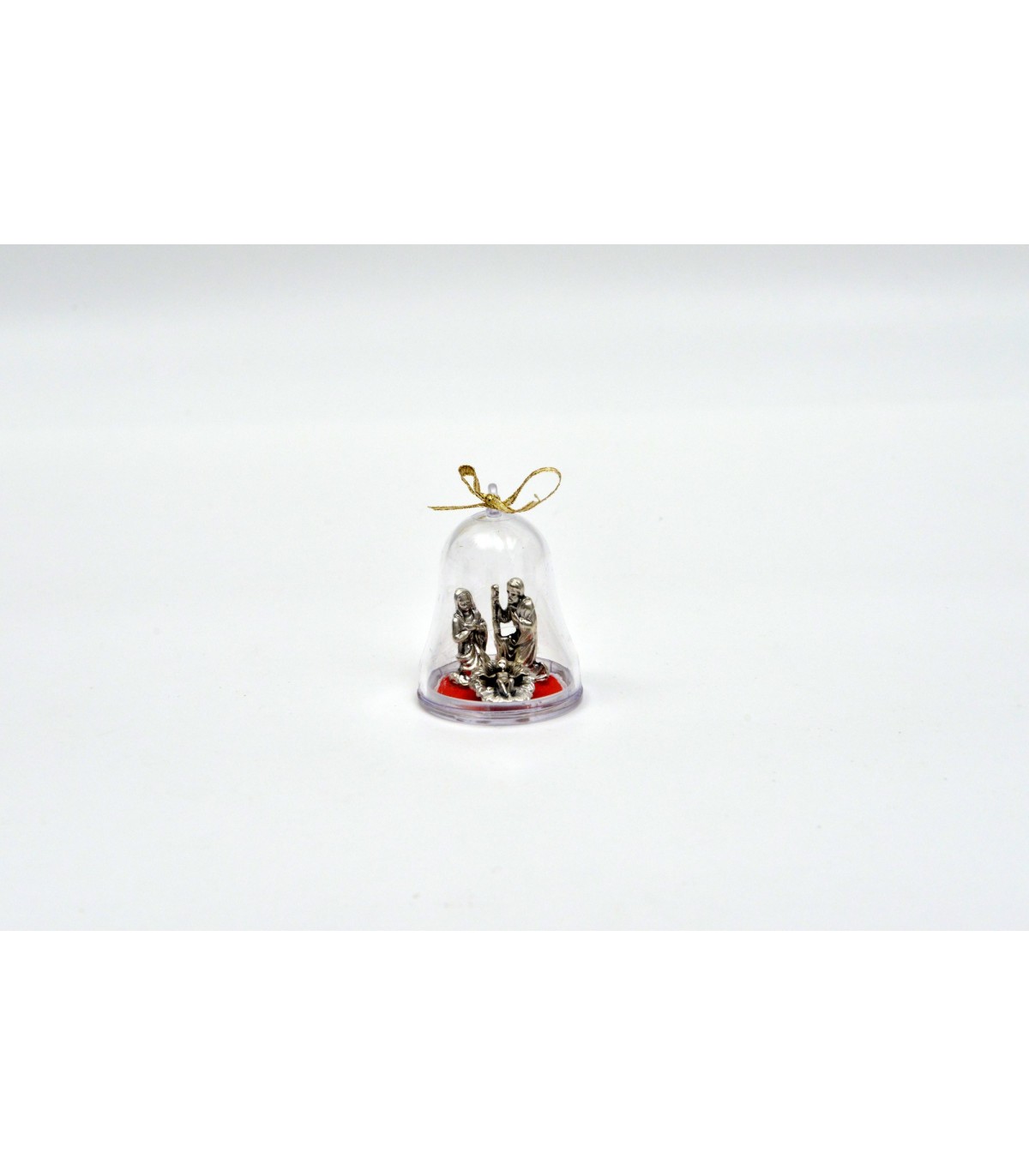 SACRA FAMIGLIA IN METALLO ARGENTATO RACCHIUSA IN CAMPANA DI PLASTICA.6X4,5X4,5 CM