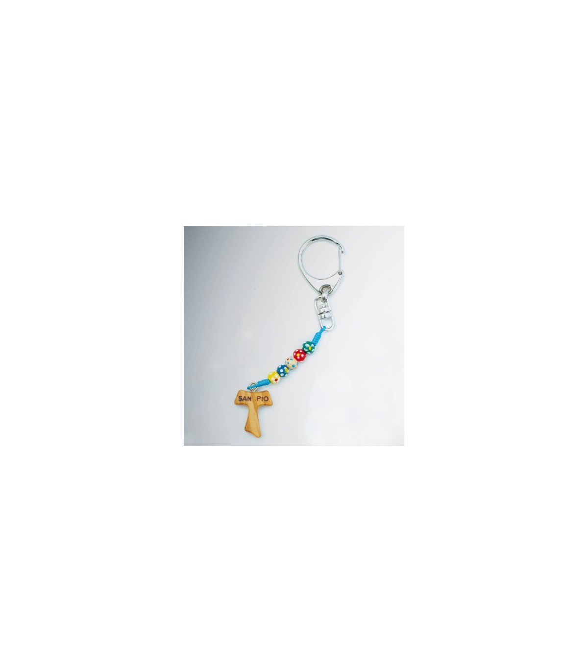 Portachiavi in metallo e cinturino con decina di rosario missionario in legno stagionato a secco. Formato da grani tondi dipinti a mano con colori diversi: verde per l’Africa, rosso per l’America, bianco per l’Europa, azzurro per l’Oceania e giallo per l’Asia. Tau in legno d’ulivo con scritta: “San Pio”.