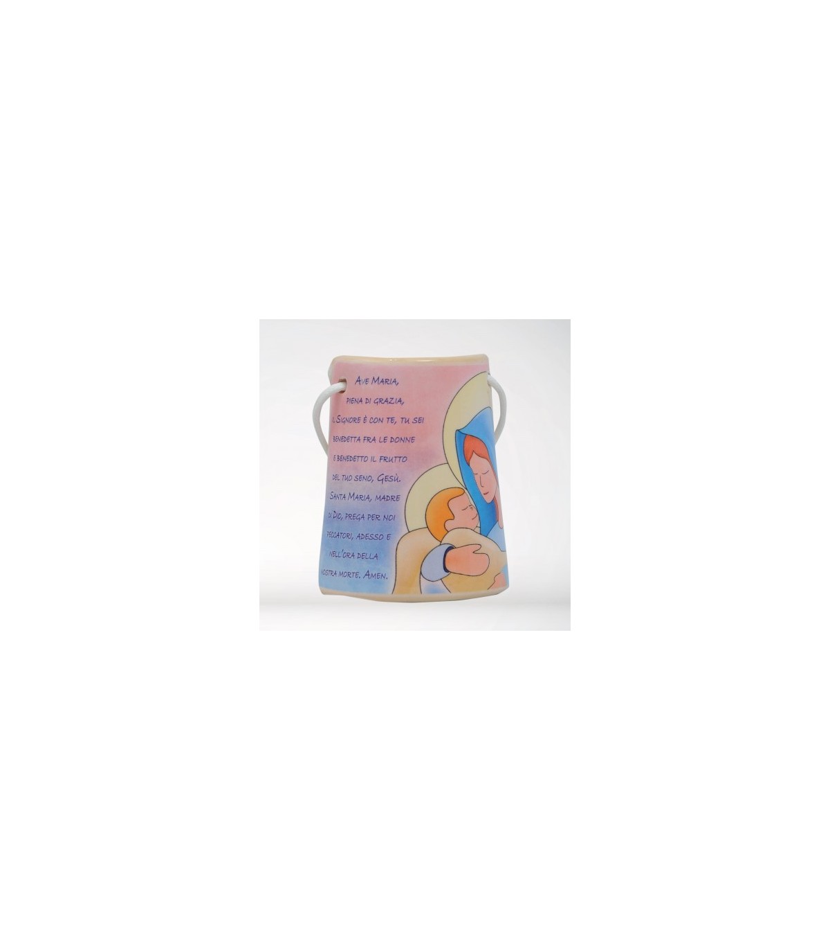 Quadretto in ceramica a forma di tegola. Stampa in quadricromia resinata dell’immagine raffigurante Madonna con Bambino e preghiera. Gancio per appendere formato da filo in corda naturale.(italiano)