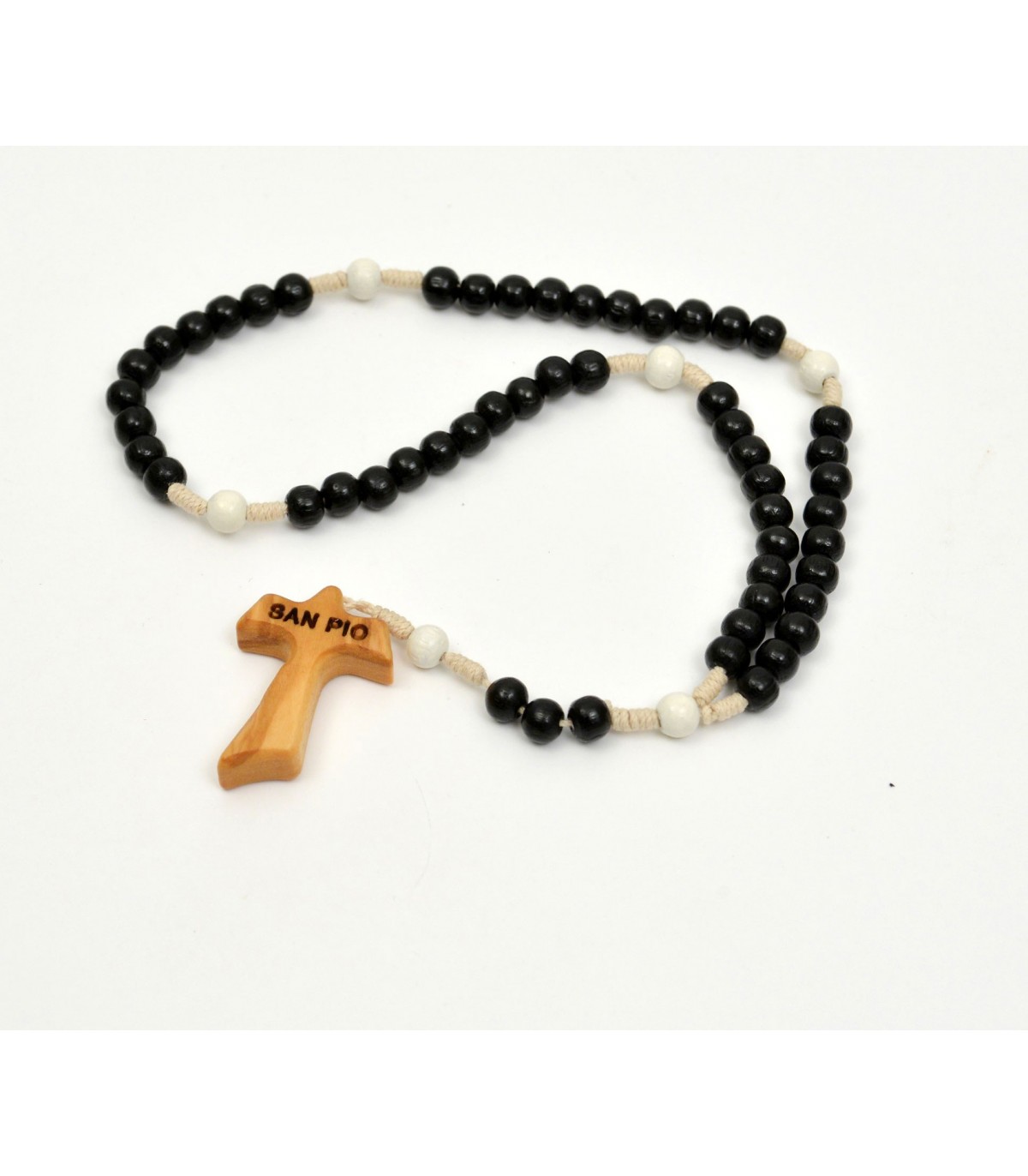 ROSARIO IN LEGNO LACCATO STAGIONATO A SECCO, CON GRANI LISCI TONDI E LEGATURA IN CORDA. TAU IN LEGNO DI ULIVO CON SCRITTA:"SAN PIO".
