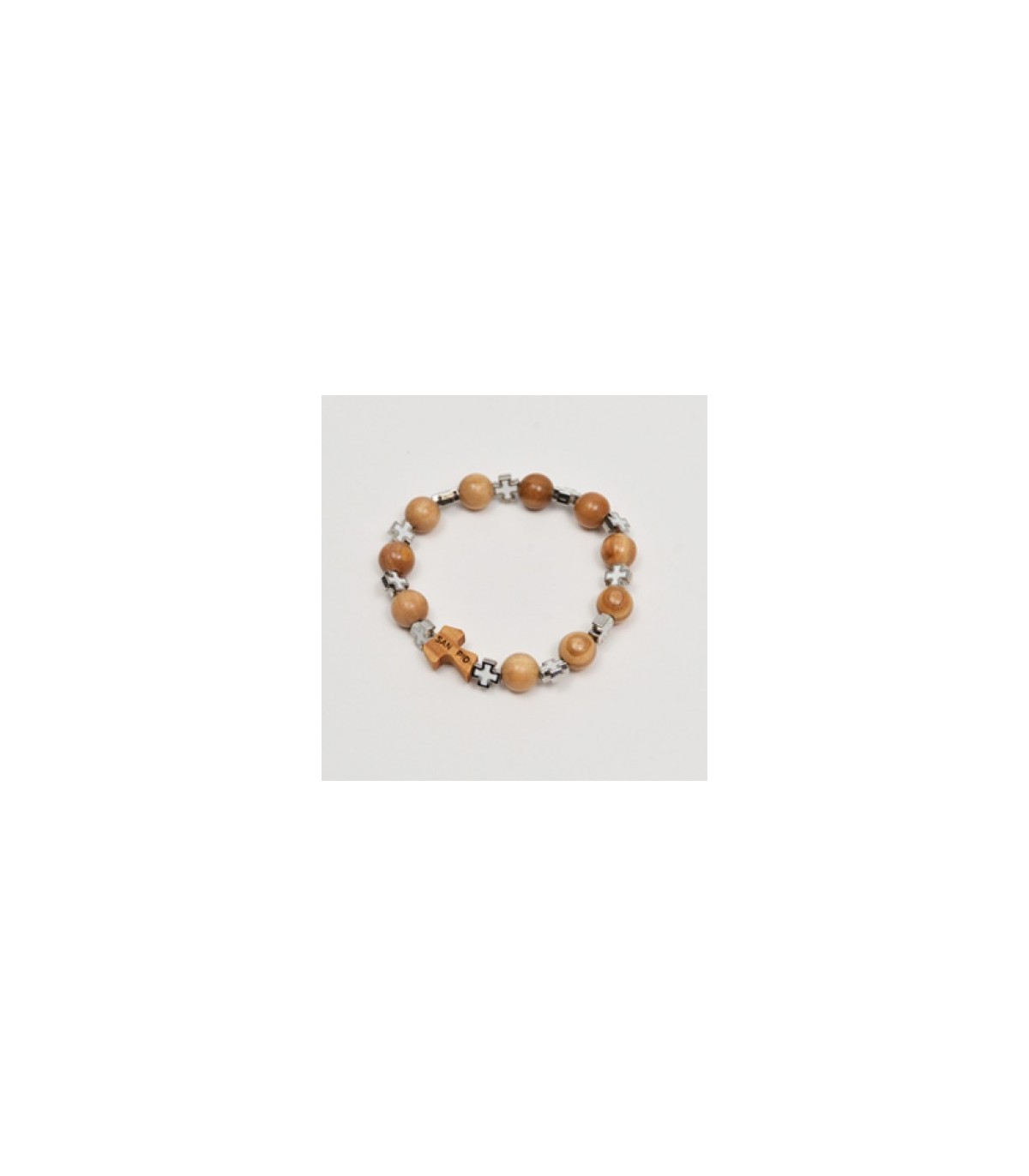 Preta madeira seca e temperada, grãos redondos em madeira de Oliveira intercaladas com cruz celta em esmalte branco. Ligadura elástica. Tau em madeira de Oliveira com a inscrição "San Pio".